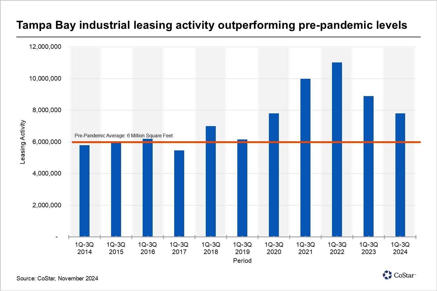 Through the end of the third quarter, the Tampa Bay market recorded roughly 7.8 million square feet of leasing activity. The comparable three-quarter average between 2014 and 2019 was six million square feet. The market is seeing approximately 30% more leasing activity than it would typically see pre-pandemic.